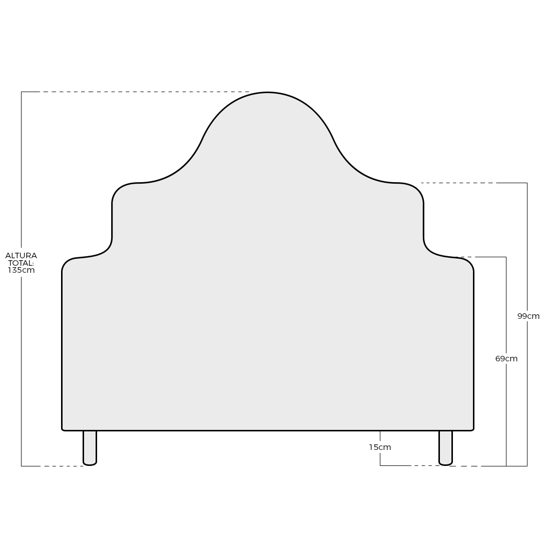 El diseño del cabecero destaca por su silueta superior de líneas curvas, que aporta dinamismo visual y suaviza la geometría del espacio. En todo su contorno, un ribete en tono beige remata la pieza con delicadeza, enmarcando el tapizado y reforzando su calidad estética. Cada detalle ha sido cuidado al máximo para ofrecer una pieza que combina elegancia, simplicidad y funcionalidad.