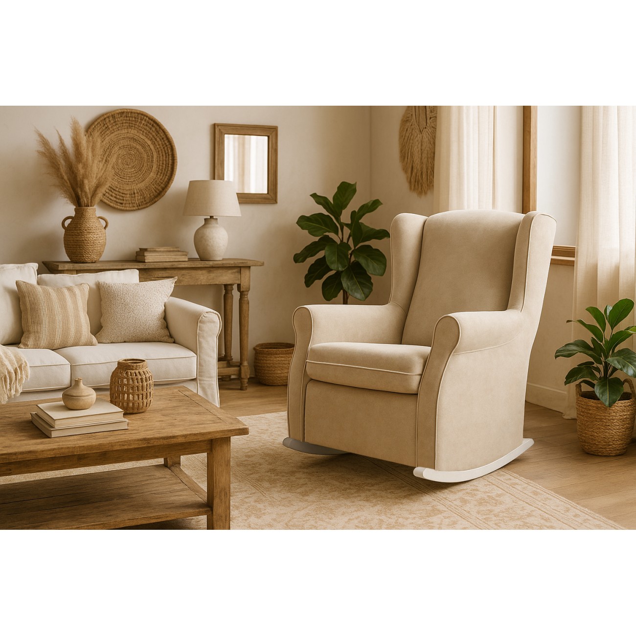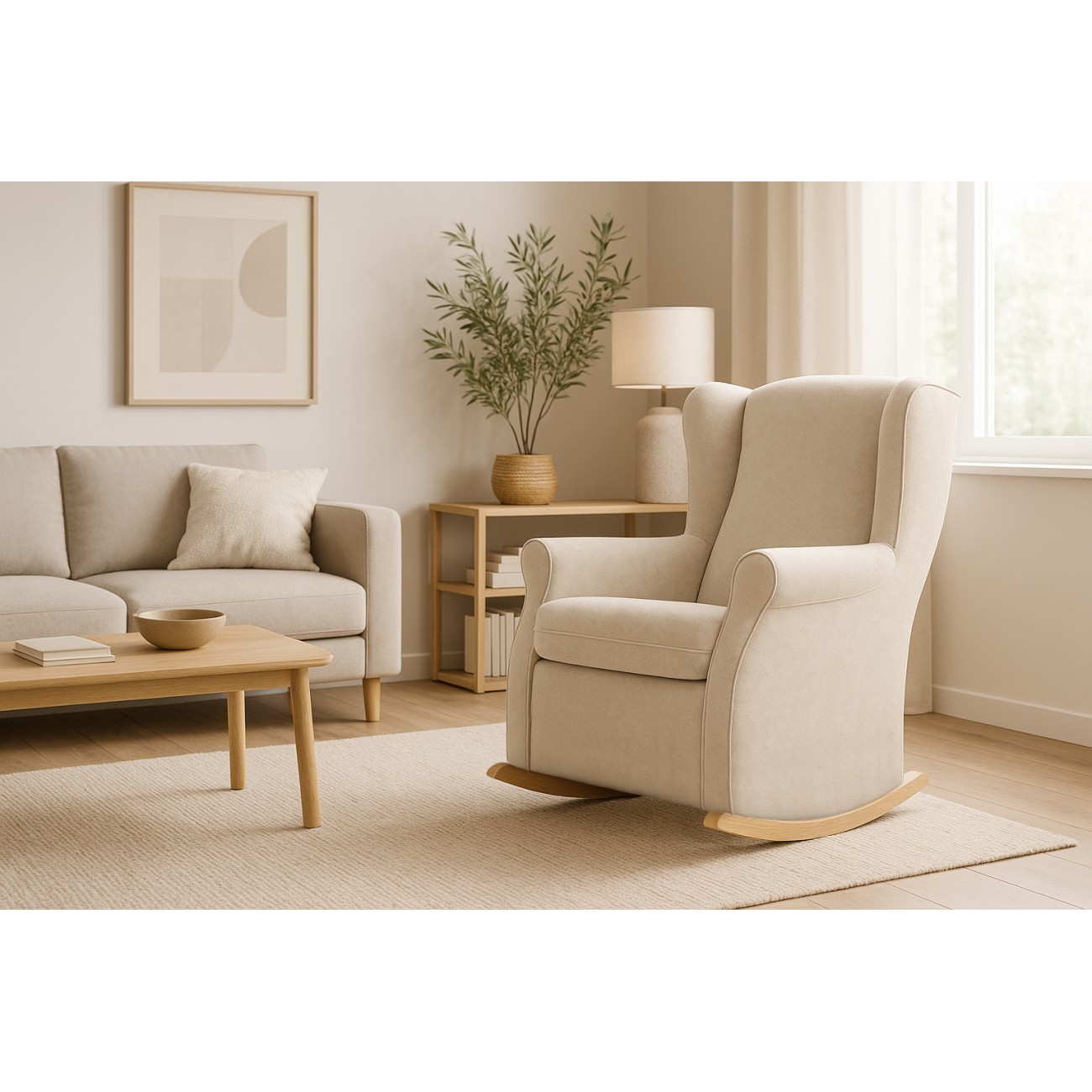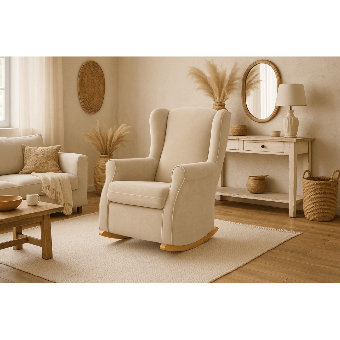 Sillón balancín orejero de estilo clásico, tapizado en tela antimanchas. Muy cómodo, perfecto para lactancia, característico por su balanceo y su robusta estructura.