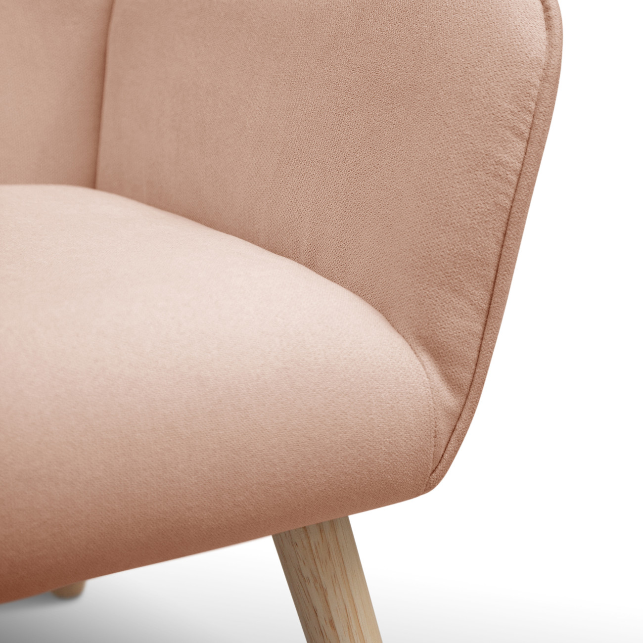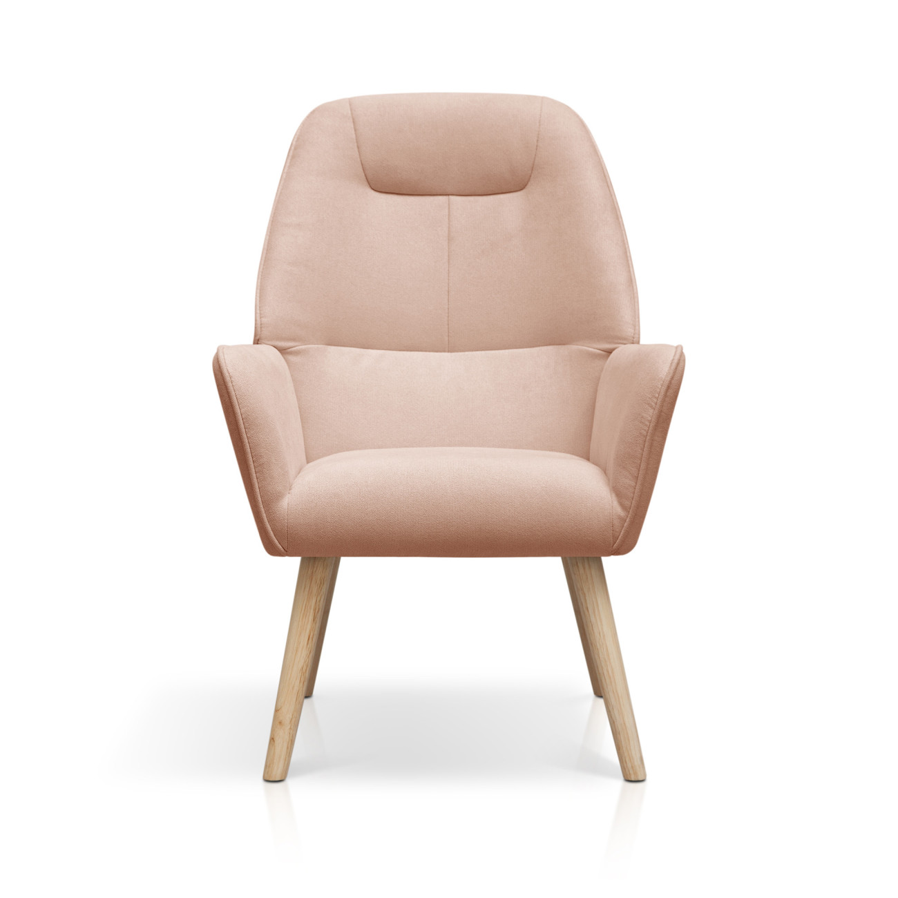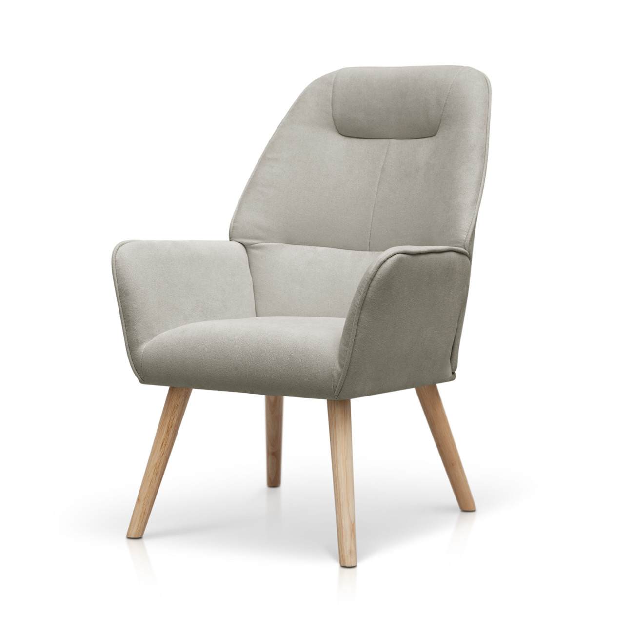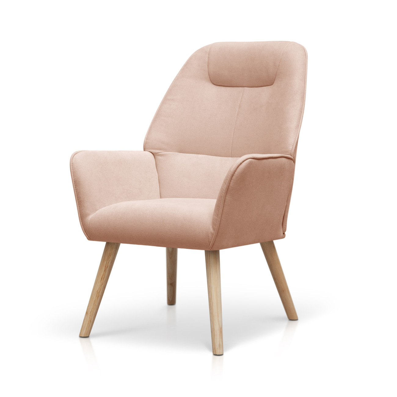 Butaca Telmo con tapizado anti-manchas en colores pastel, estructura de madera y relleno de espumación HR. Incorpora patas cónicas de madera de haya maciza y un respaldo alto ergonómico con costuras decorativas horizontales.