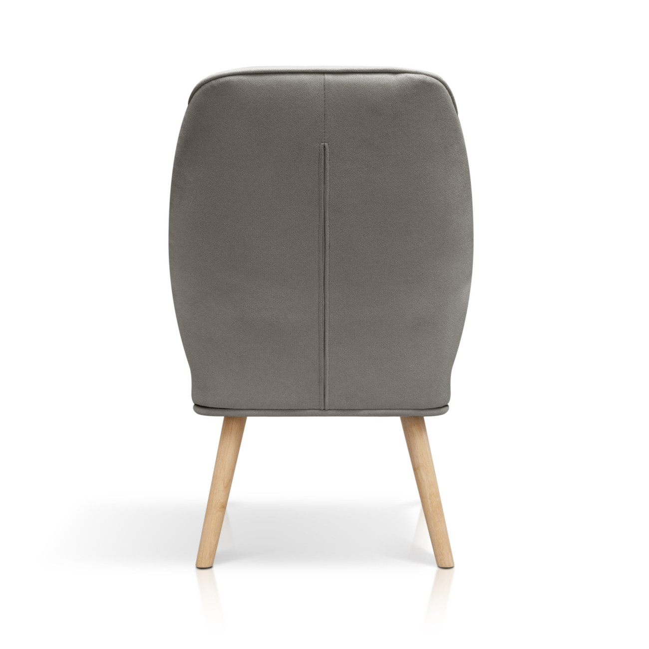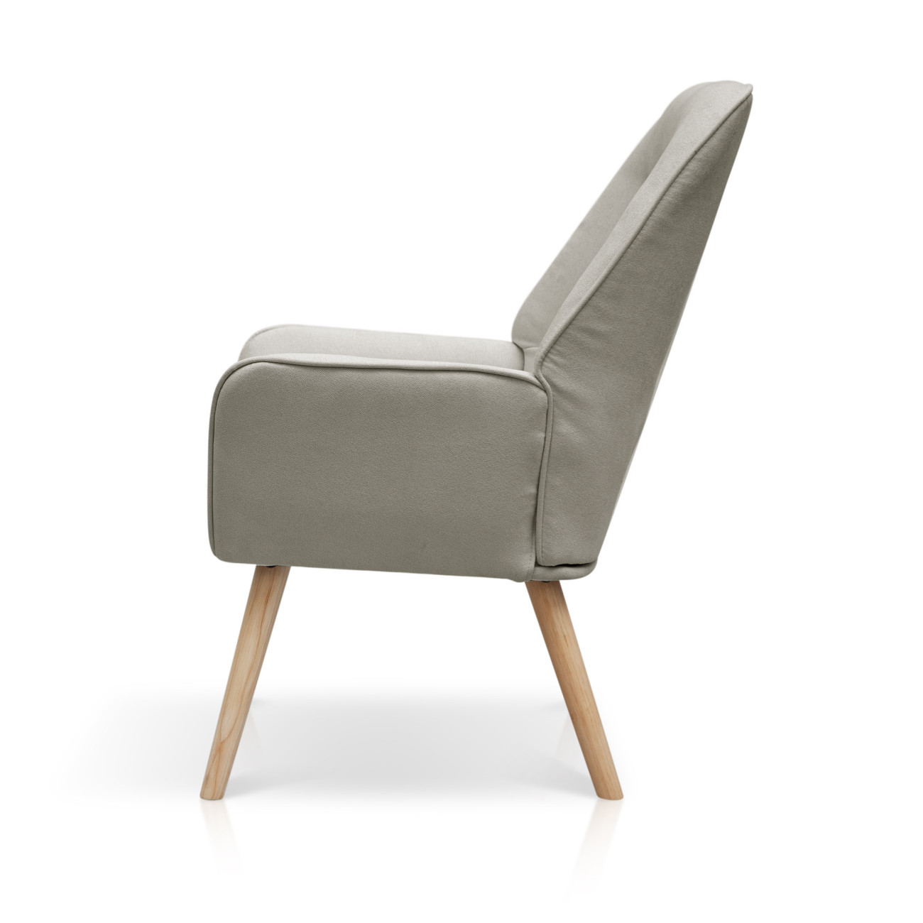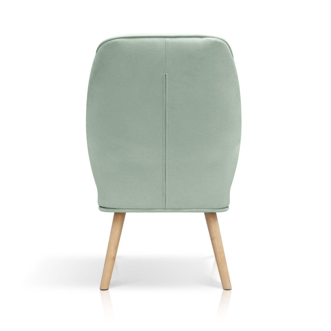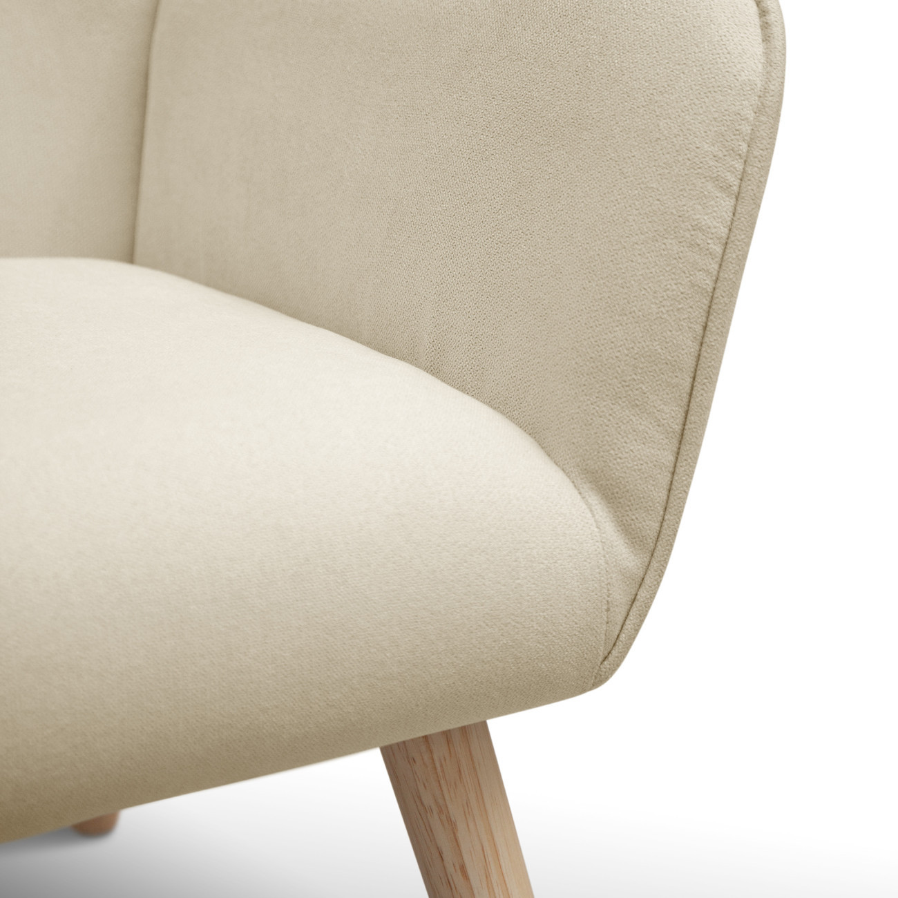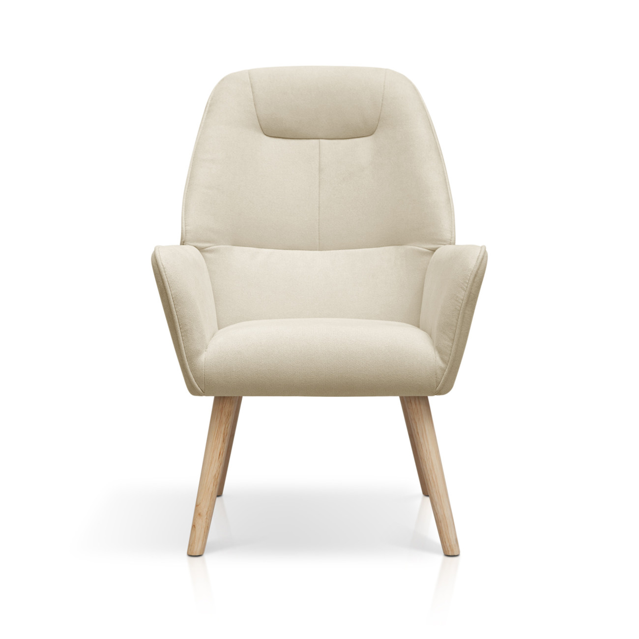 Butaca Telmo con tapizado anti-manchas en colores pastel, estructura de madera y relleno de espumación HR. Incorpora patas cónicas de madera de haya maciza y un respaldo alto ergonómico con costuras decorativas horizontales.