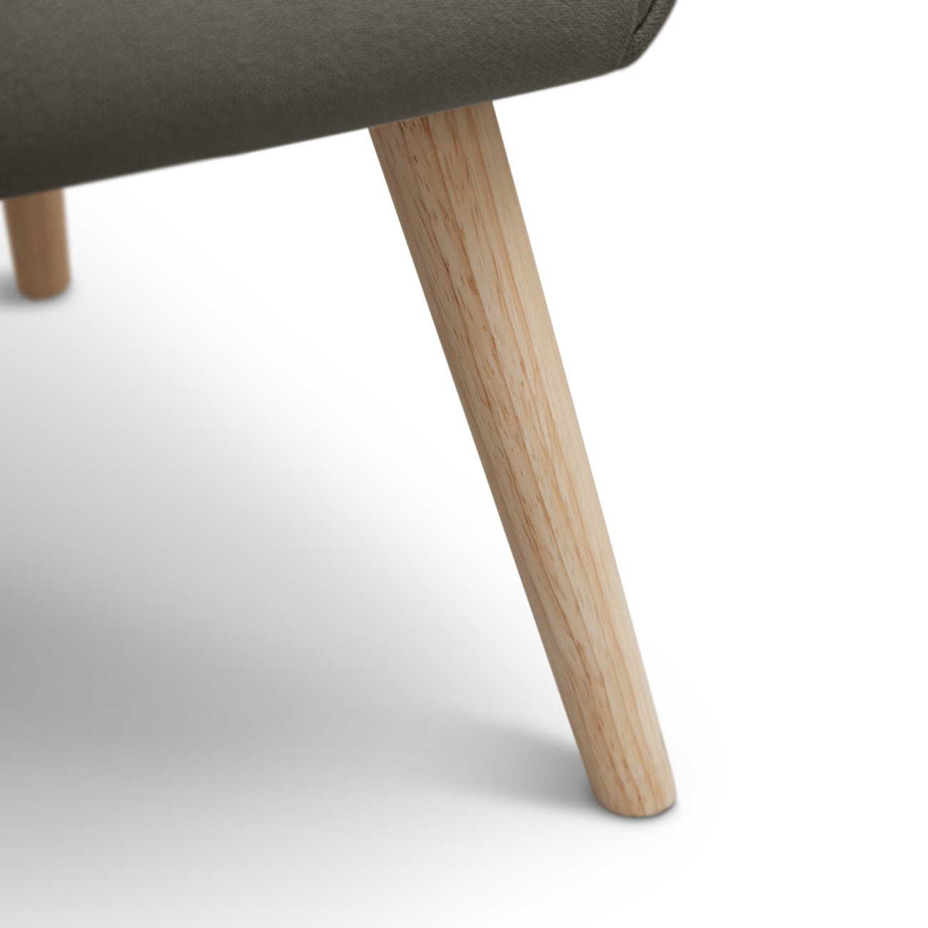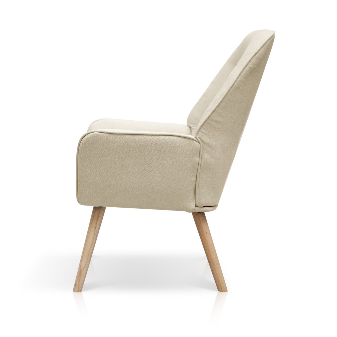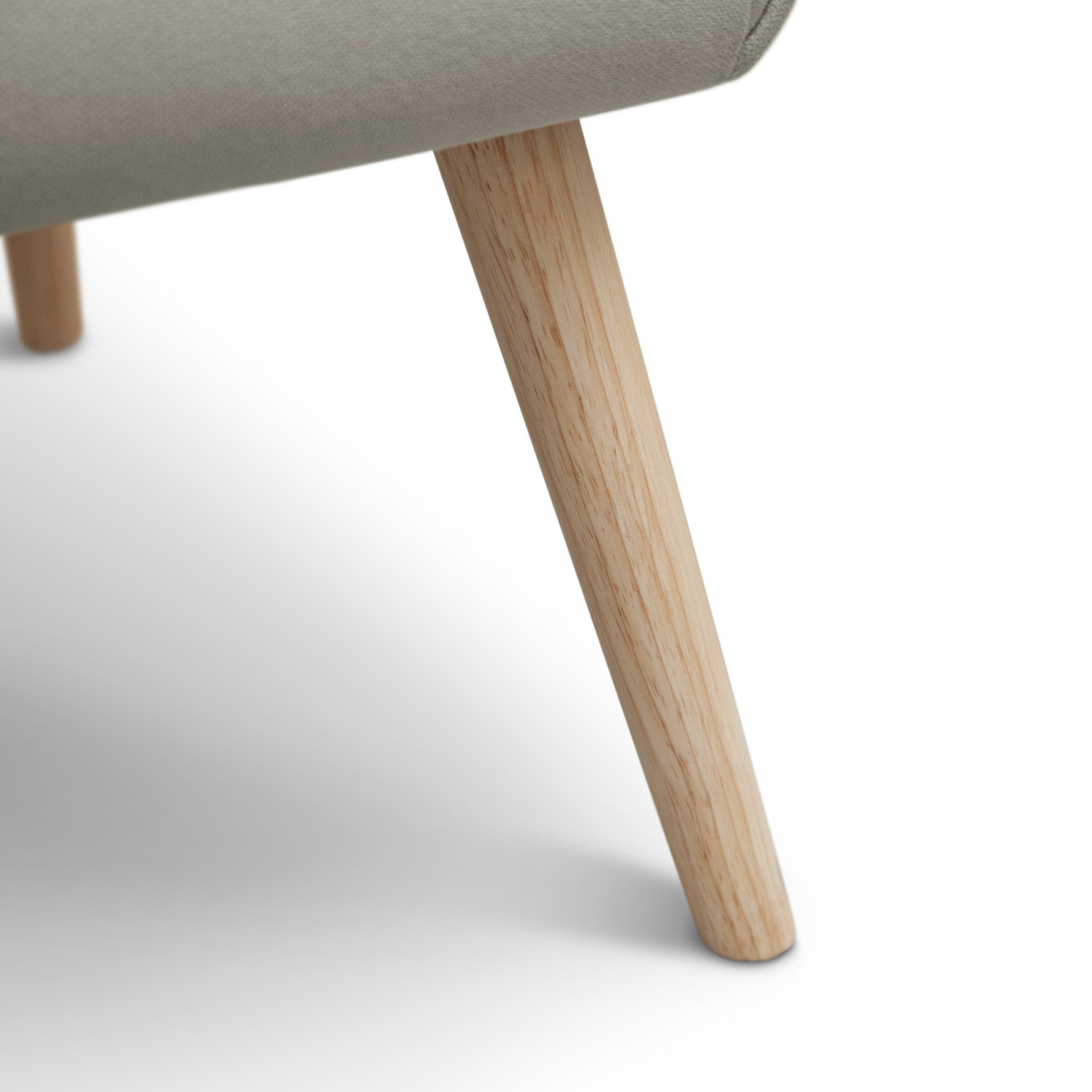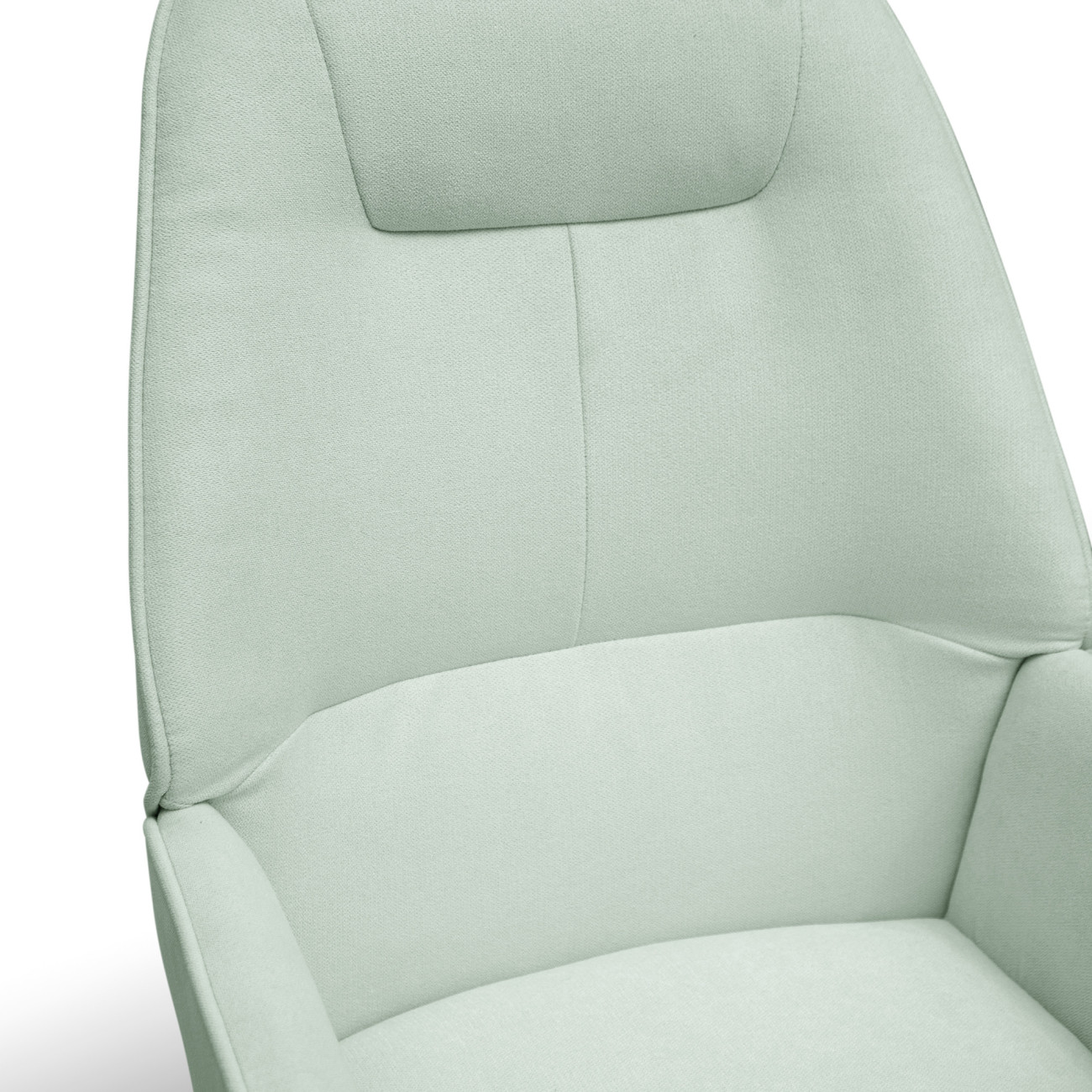 Butaca Telmo con tapizado anti-manchas en colores pastel, estructura de madera y relleno de espumación HR. Incorpora patas cónicas de madera de haya maciza y un respaldo alto ergonómico con costuras decorativas horizontales.
