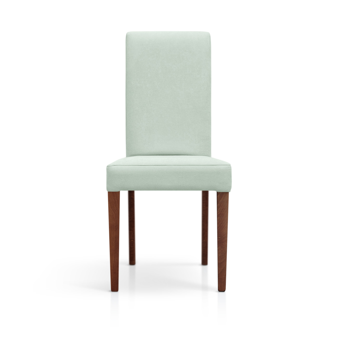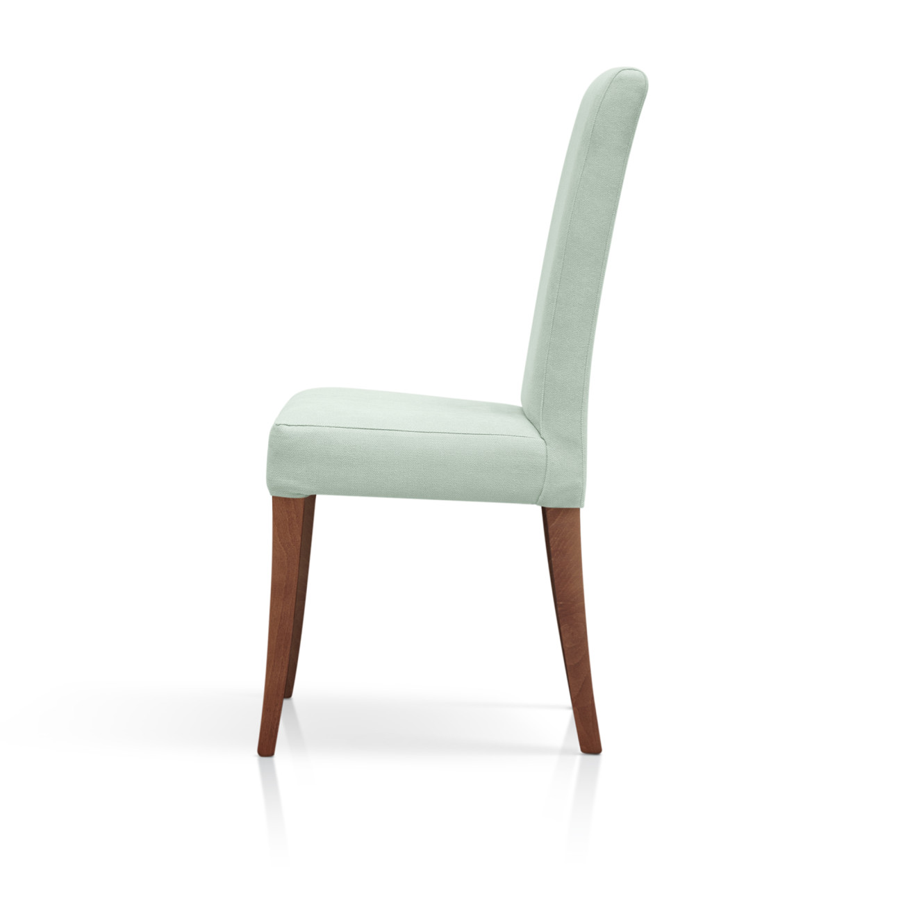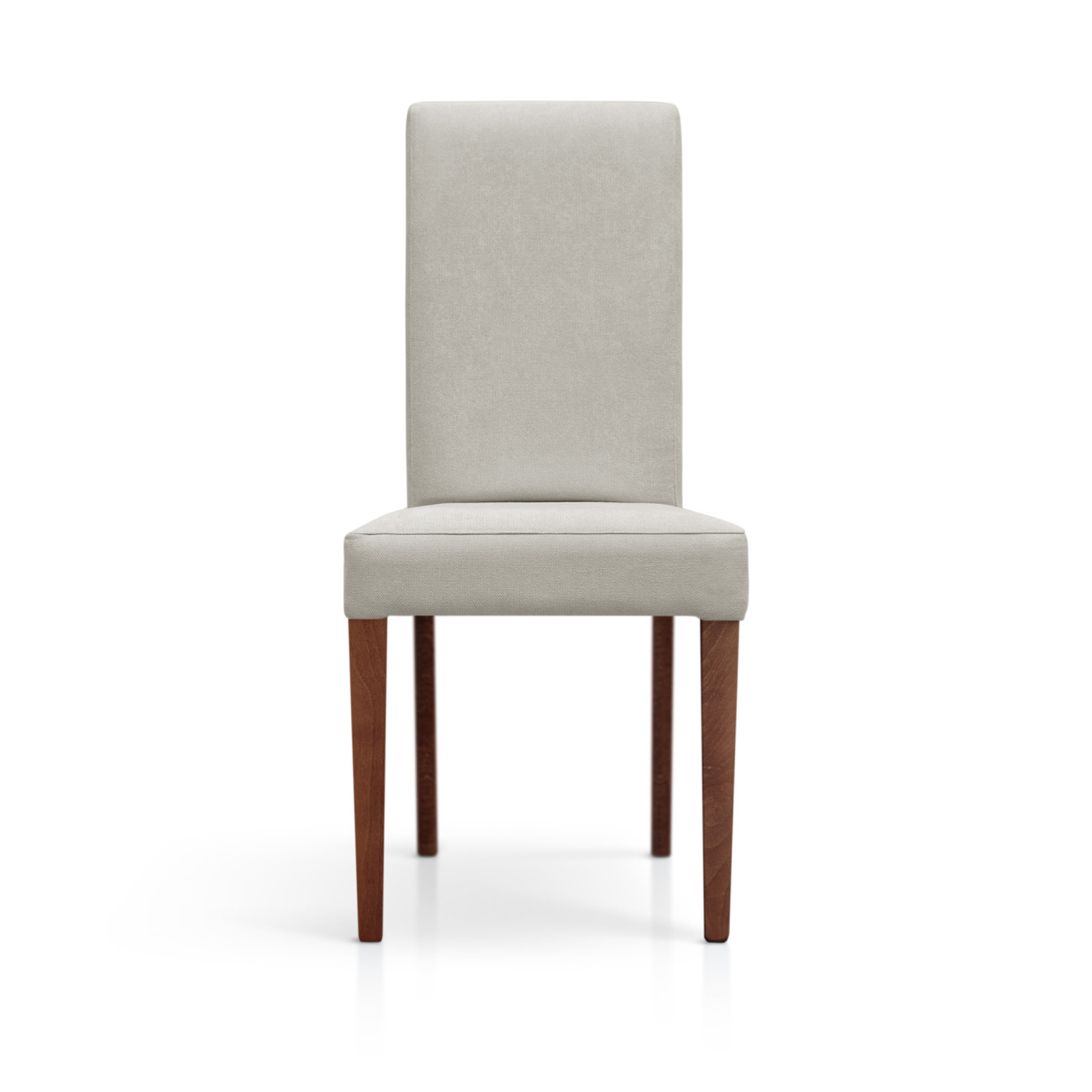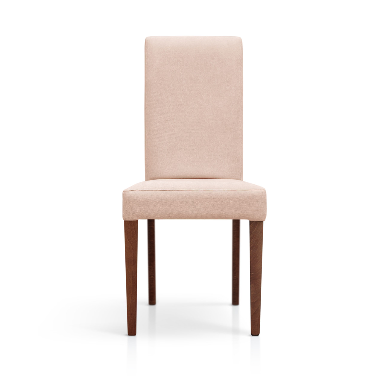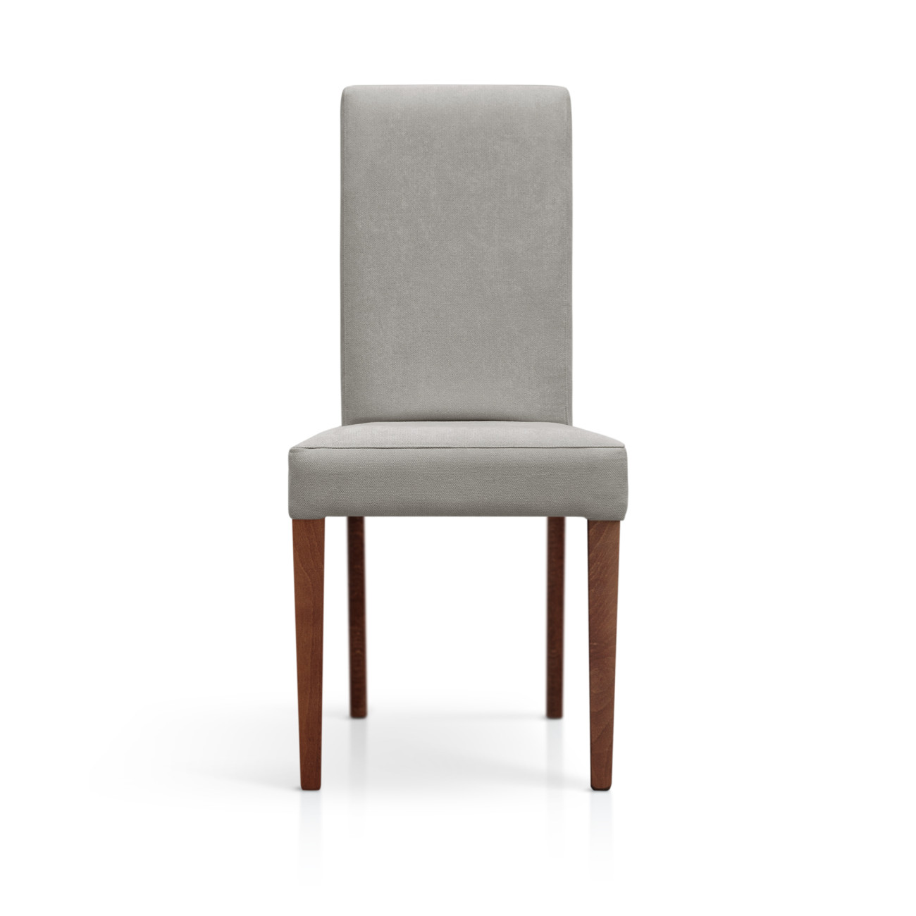 Silla Palmira tapizada en tela anti-manchas en tonos pastel, estructura de madera y relleno de espumación HR. Diseño de líneas rectas con respaldo alto y cuatro patas robustas de madera de haya maciza en acabado Nogal.