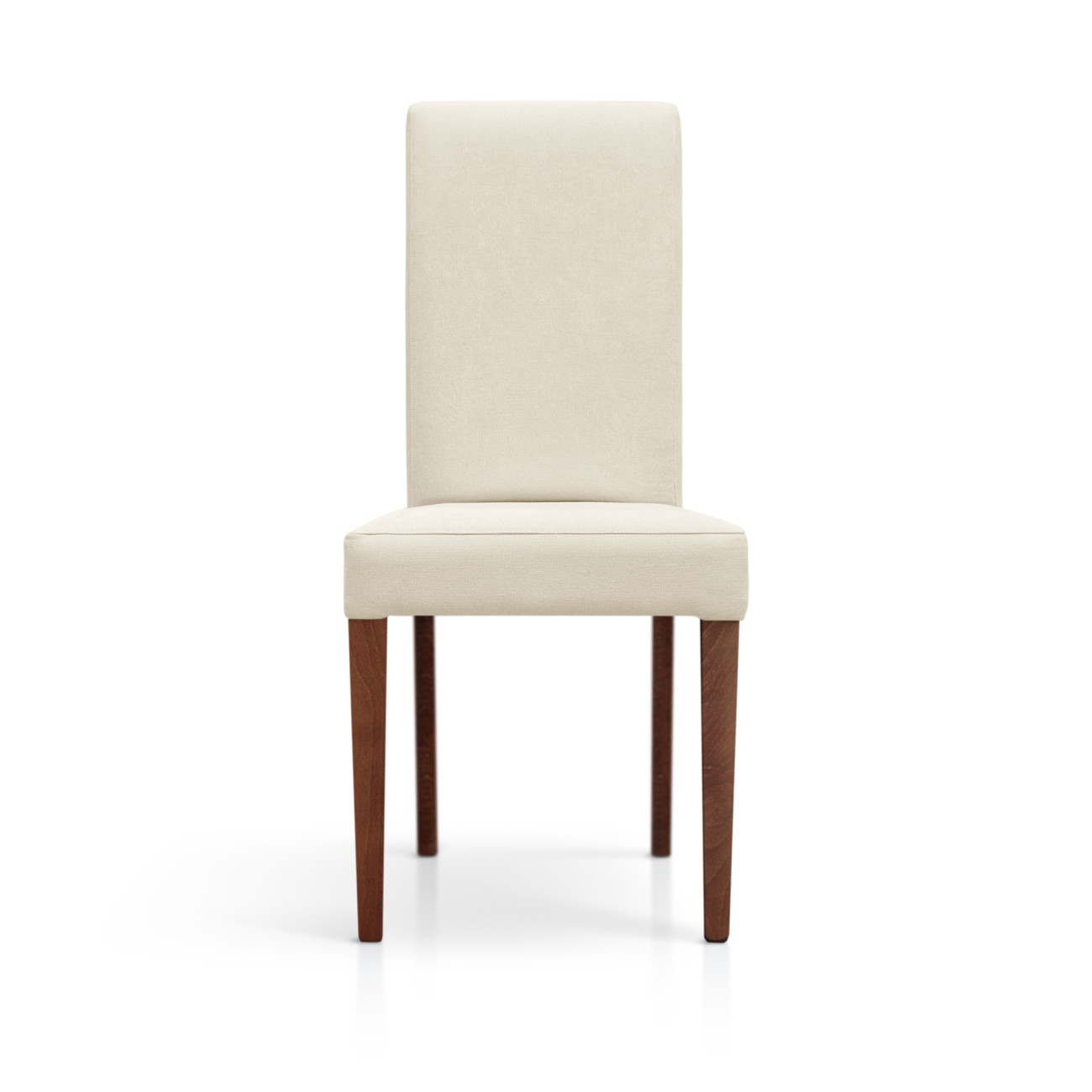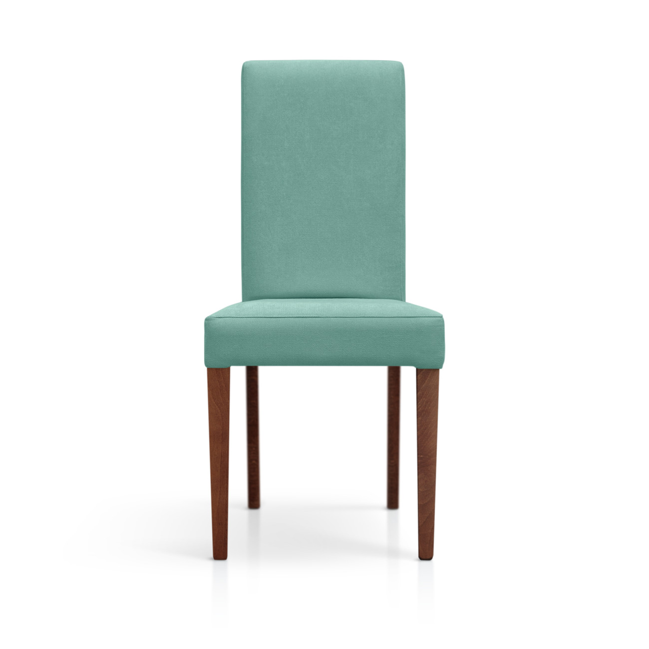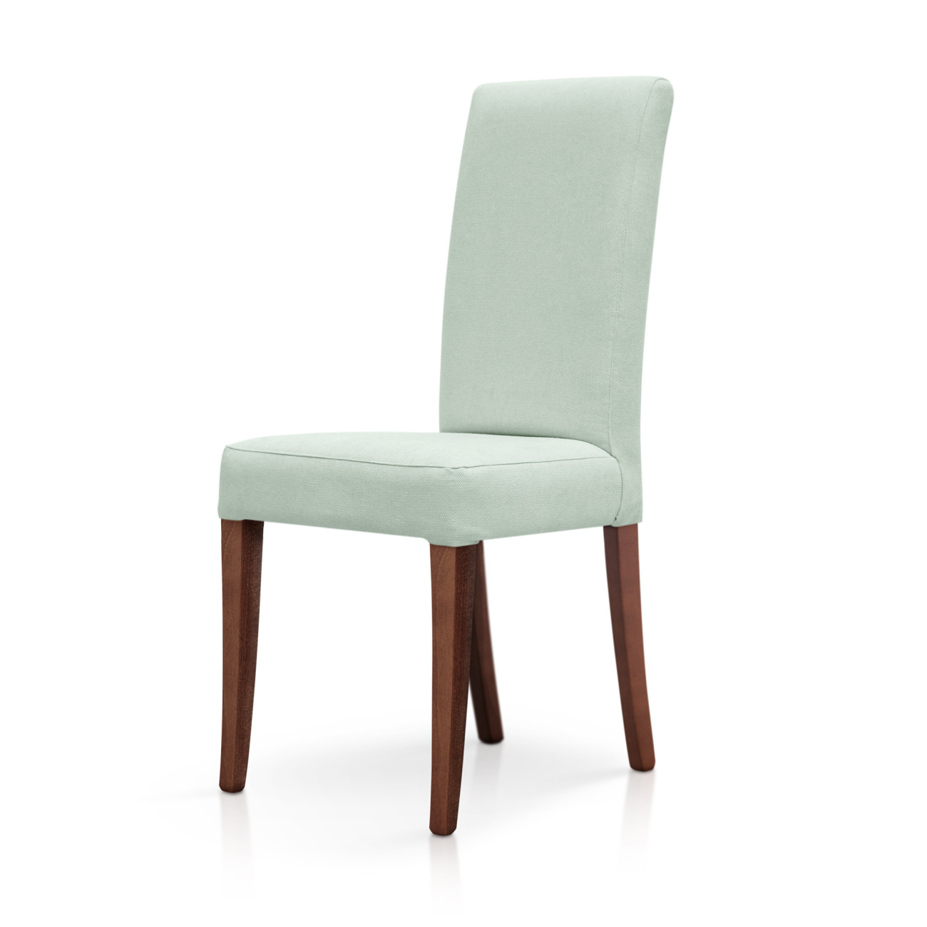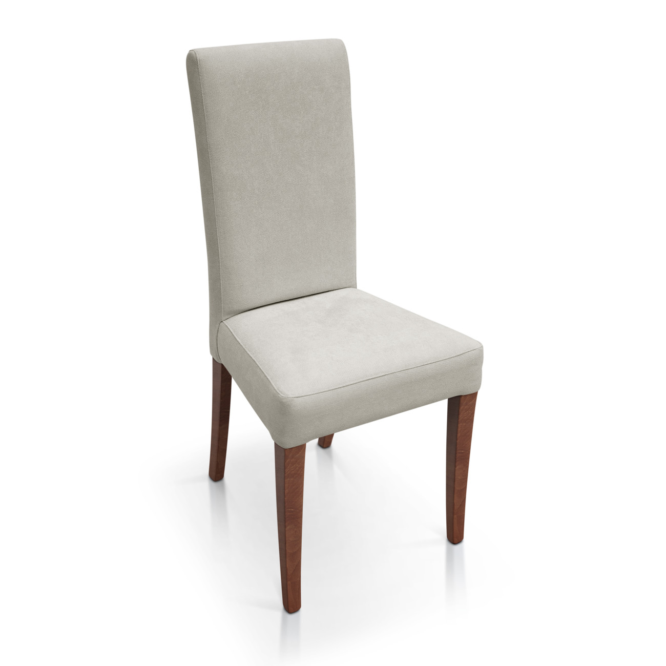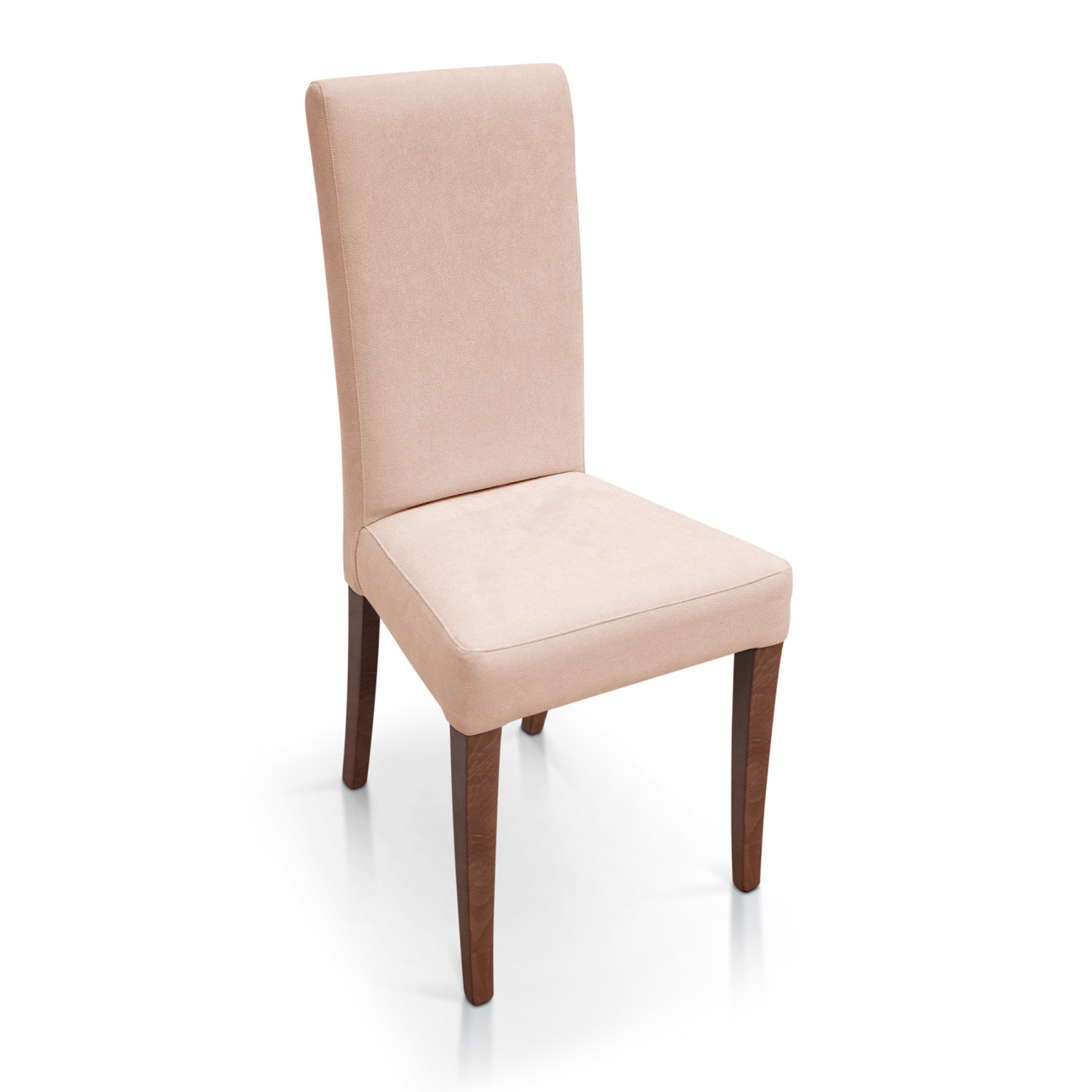 Silla Palmira tapizada en tela anti-manchas en tonos pastel, estructura de madera y relleno de espumación HR. Diseño de líneas rectas con respaldo alto y cuatro patas robustas de madera de haya maciza en acabado Nogal.
