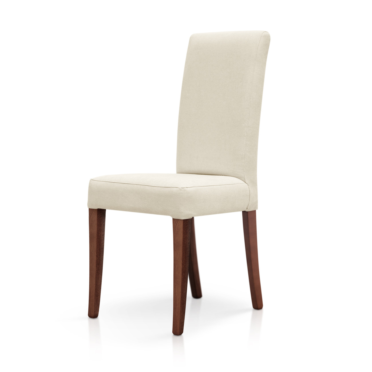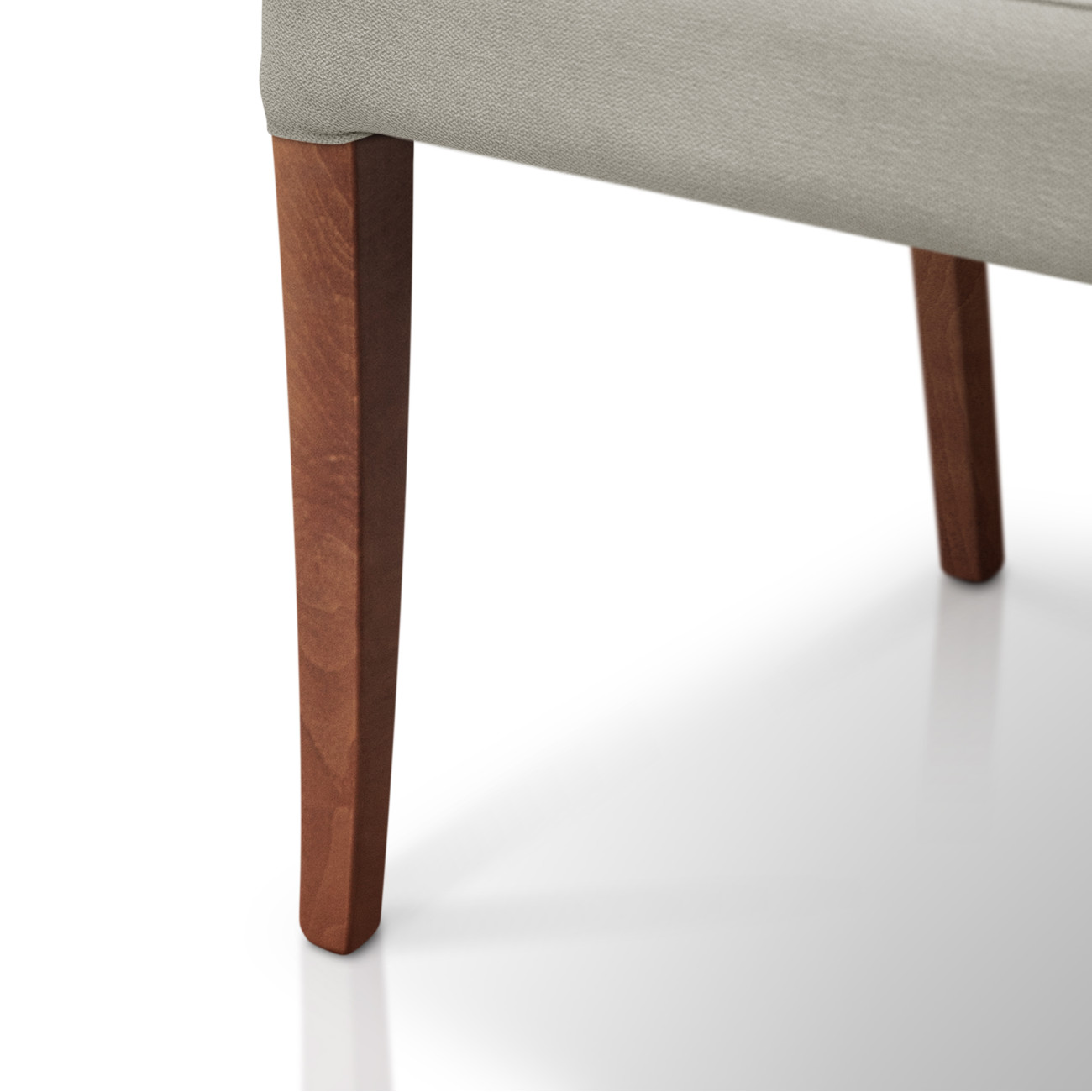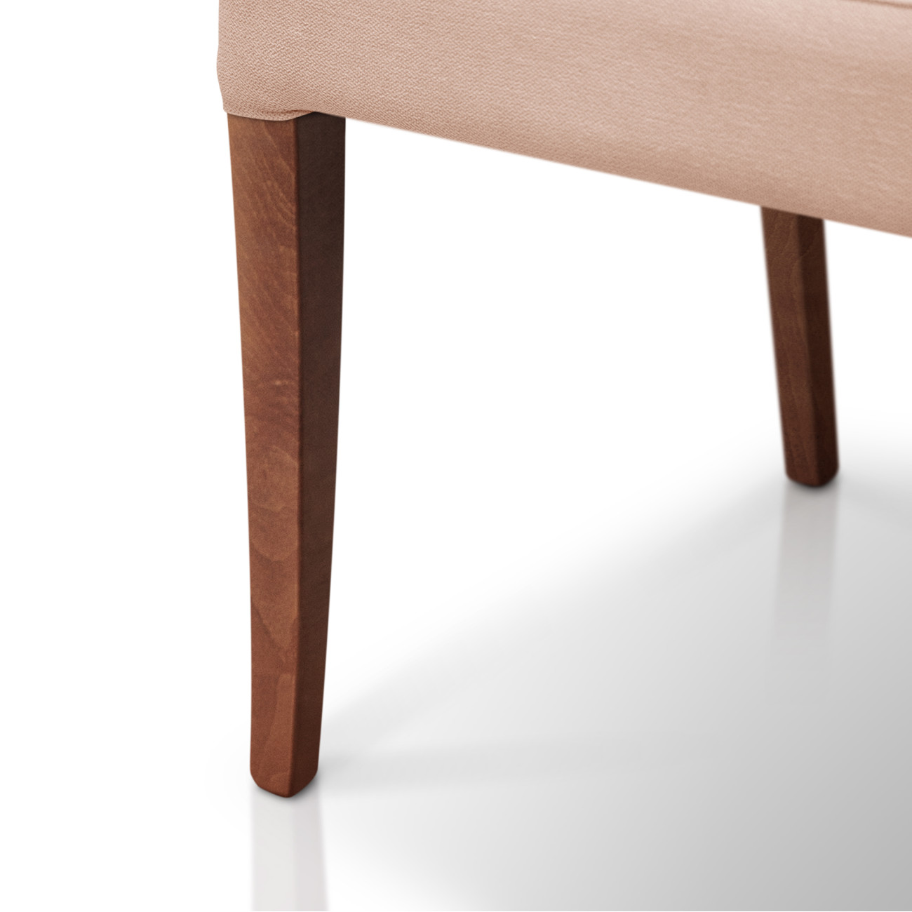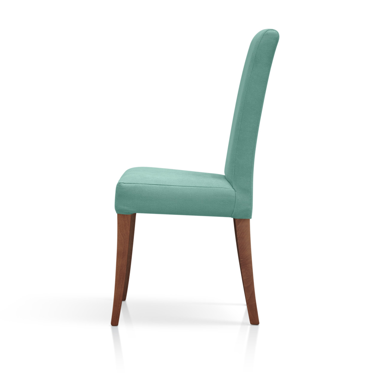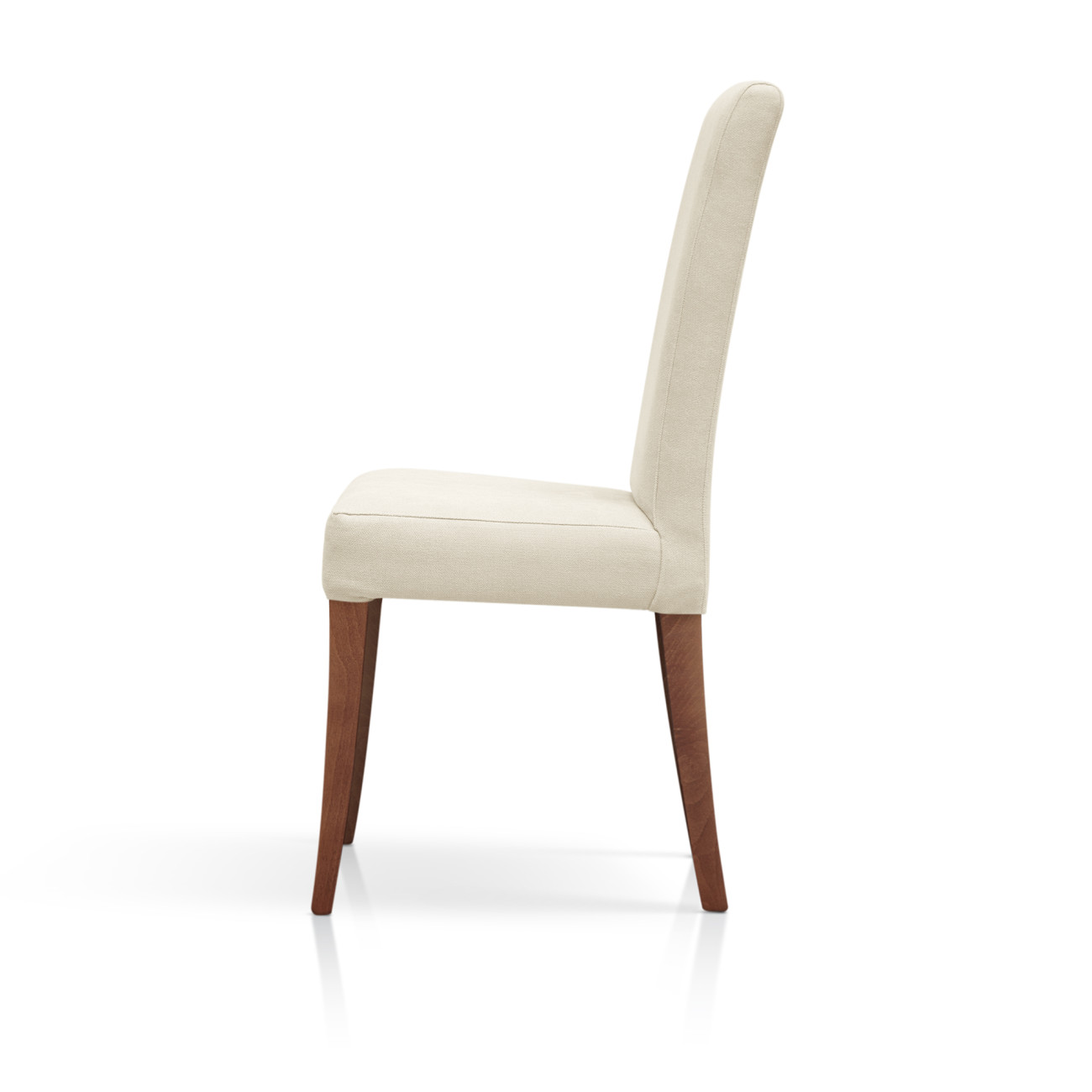 Silla Palmira tapizada en tela anti-manchas en tonos pastel, estructura de madera y relleno de espumación HR. Diseño de líneas rectas con respaldo alto y cuatro patas robustas de madera de haya maciza en acabado Nogal.