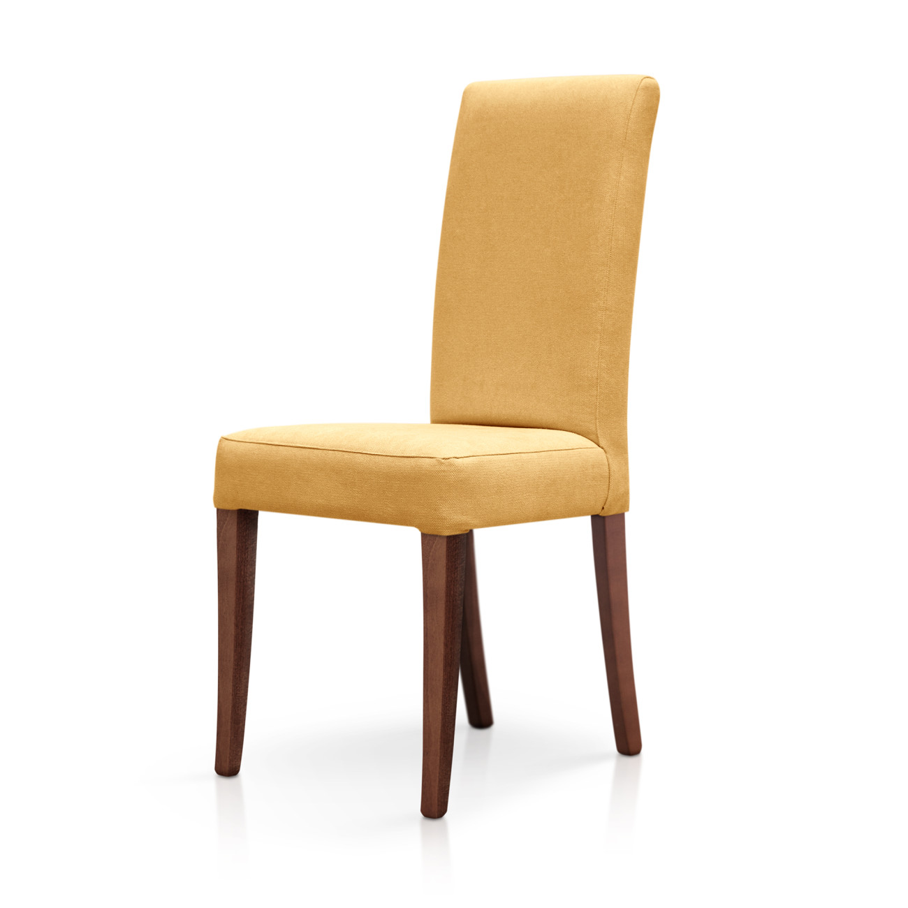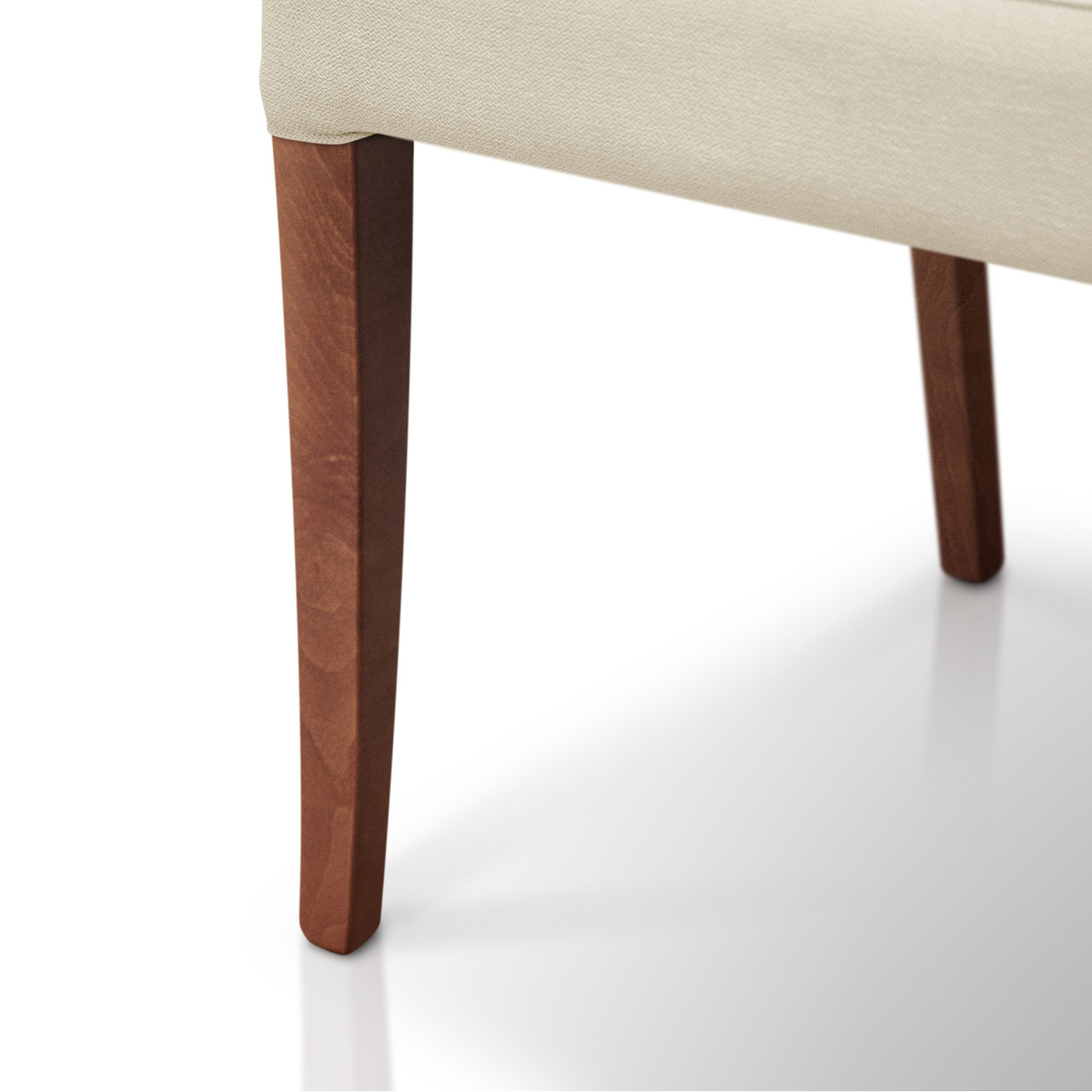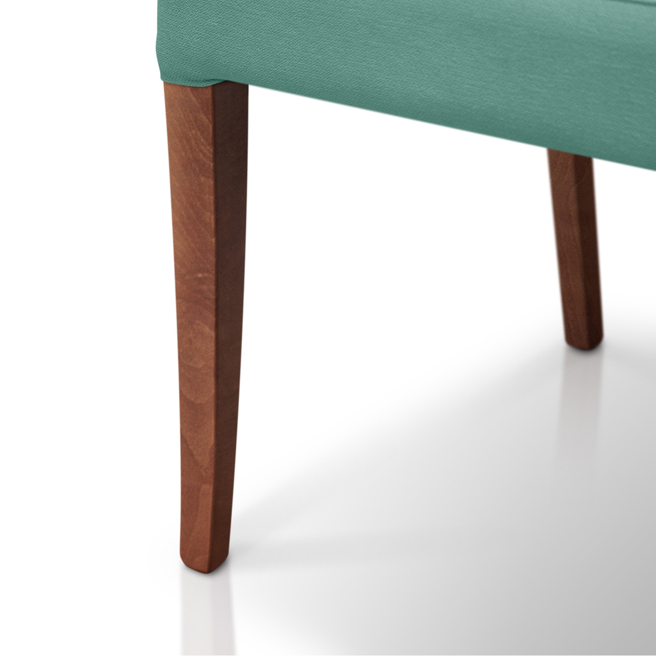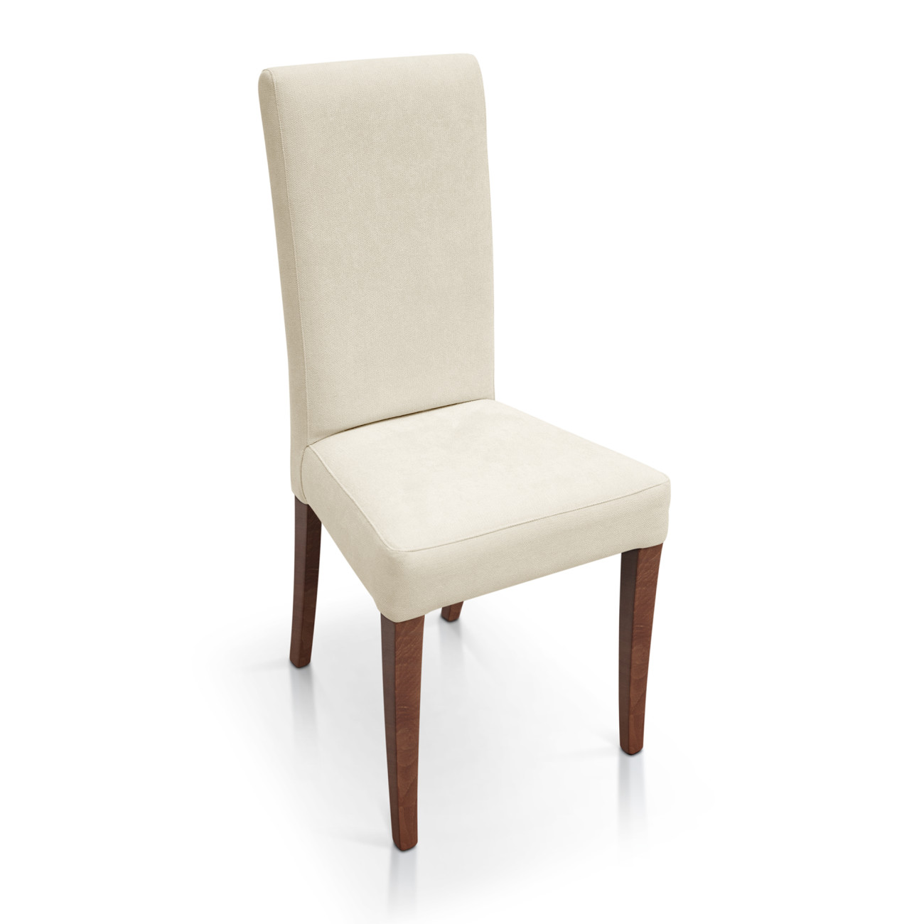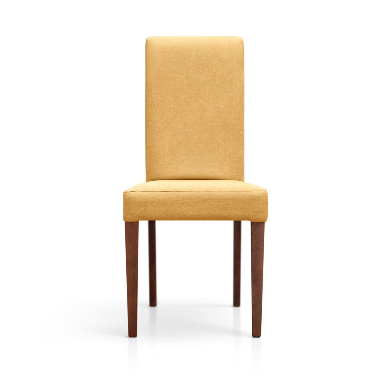Silla Palmira tapizada en tela anti-manchas en tonos pastel, estructura de madera y relleno de espumación HR. Diseño de líneas rectas con respaldo alto y cuatro patas robustas de madera de haya maciza en acabado Nogal.