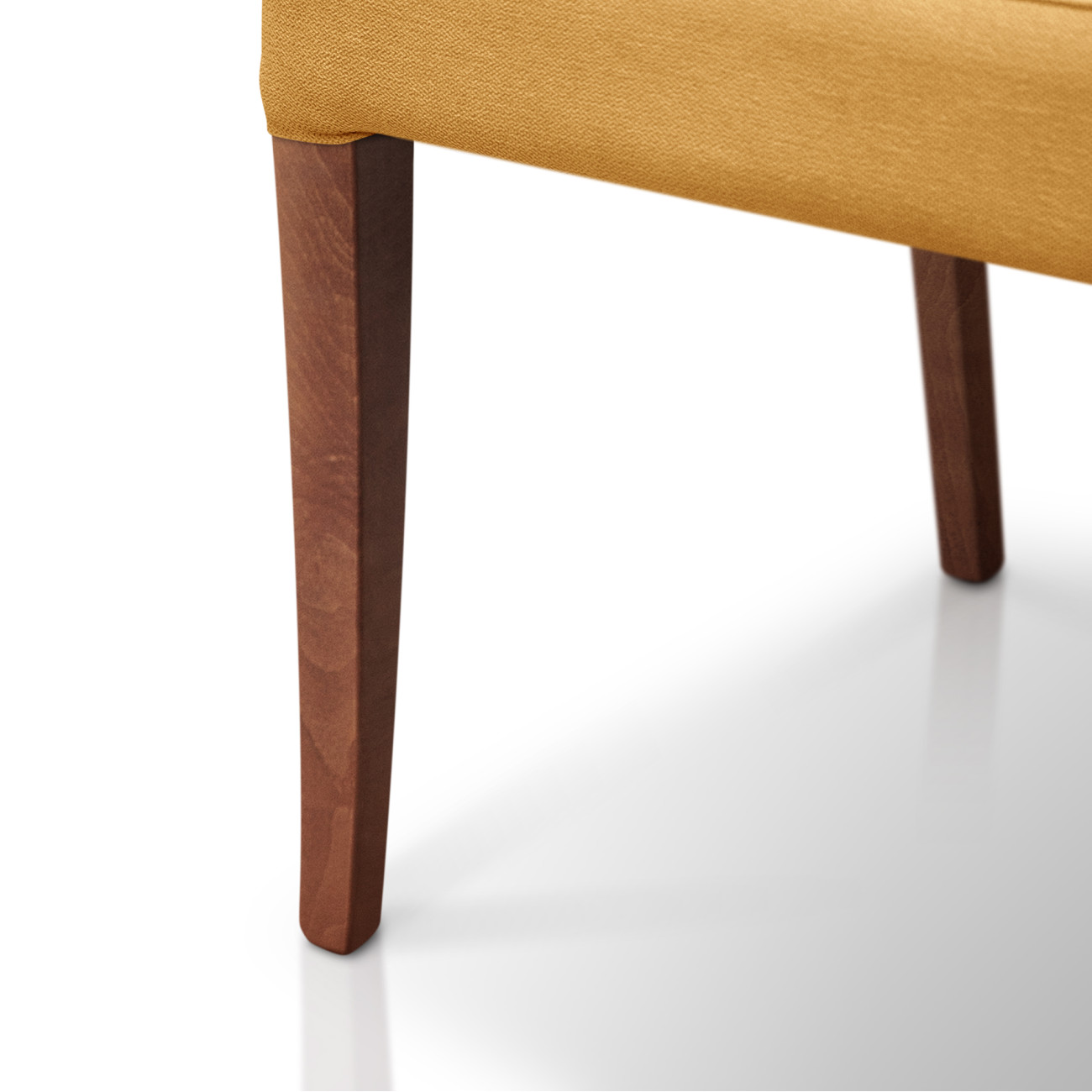 La robustez de la Silla Palmira reside en su estructura interna de madera de alta calidad y su núcleo de espumación HR (High Resilience). Este relleno de alta densidad garantiza que el asiento no pierda su firmeza ni su forma original con el tiempo. El conjunto se sustenta sobre cuatro patas macizas de madera de haya en color nogal, con un acabado natural que resalta la belleza del material y aporta una estabilidad total.