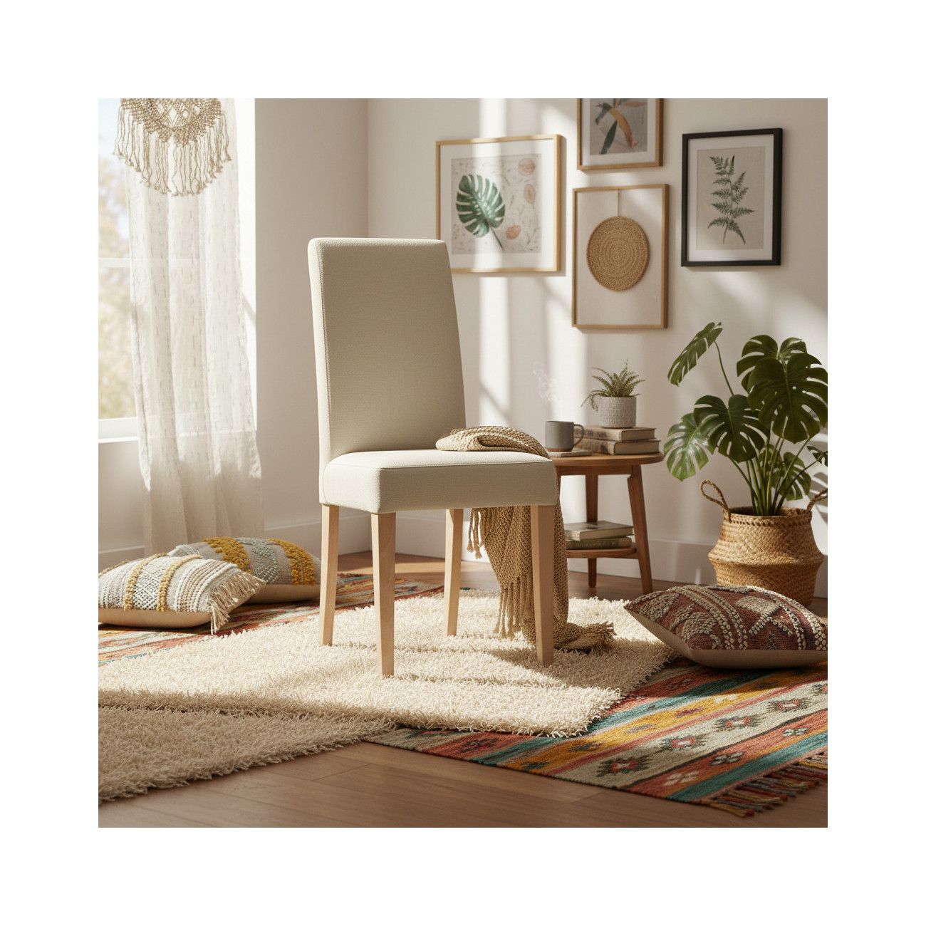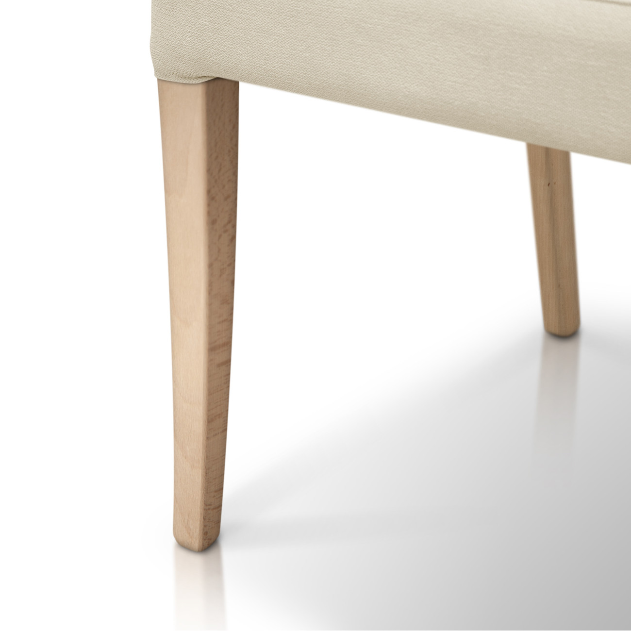 La robustez de la Silla Palmira reside en su estructura interna de madera de alta calidad y su núcleo de espumación HR (High Resilience). Este relleno de alta densidad garantiza que el asiento no pierda su firmeza ni su forma original con el tiempo. El conjunto se sustenta sobre cuatro patas macizas de madera de haya, con un acabado natural que resalta la belleza del material y aporta una estabilidad total.