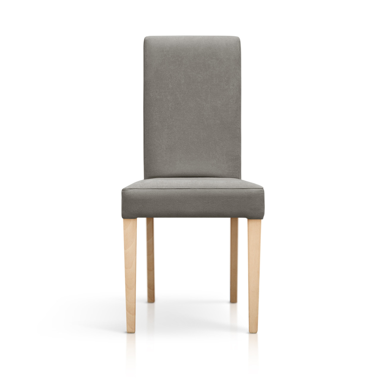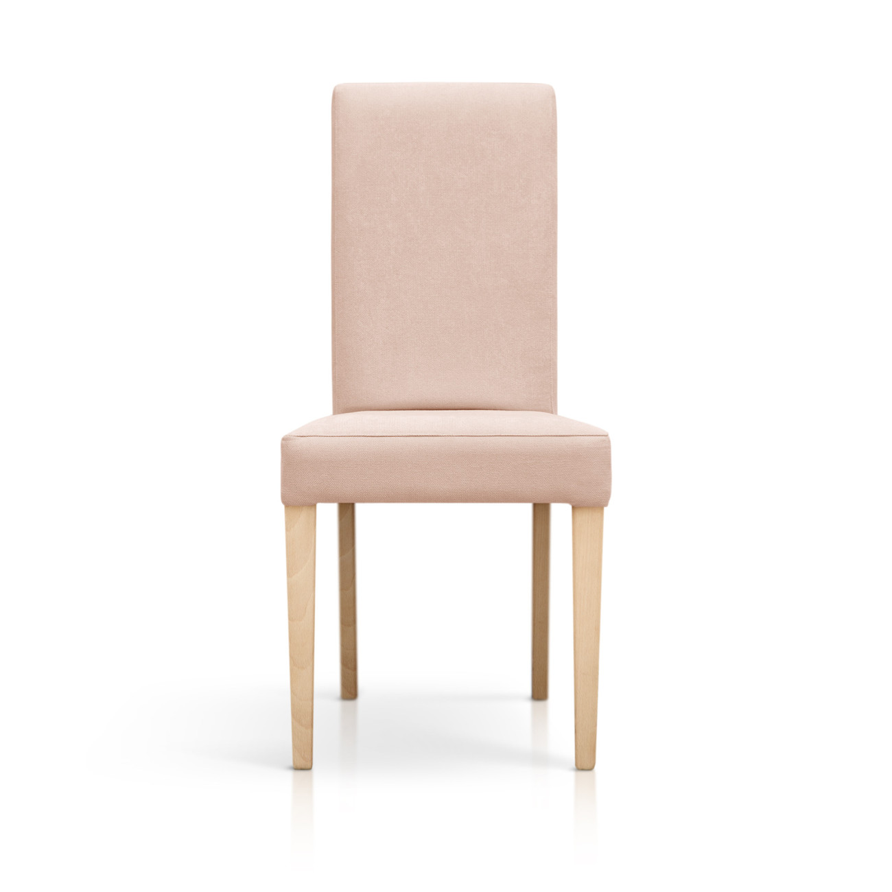 Silla Palmira tapizada en tela anti-manchas en tonos pastel, estructura de madera y relleno de espumación HR. Diseño de líneas rectas con respaldo alto y cuatro patas robustas de madera de haya maciza en acabado natural.