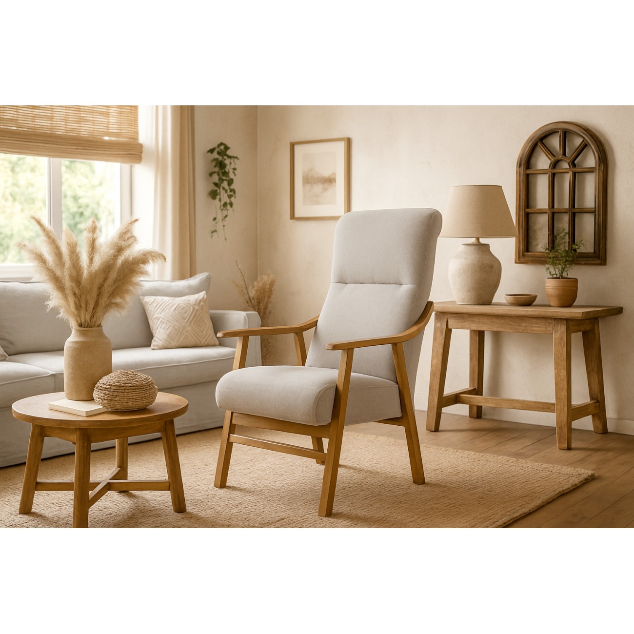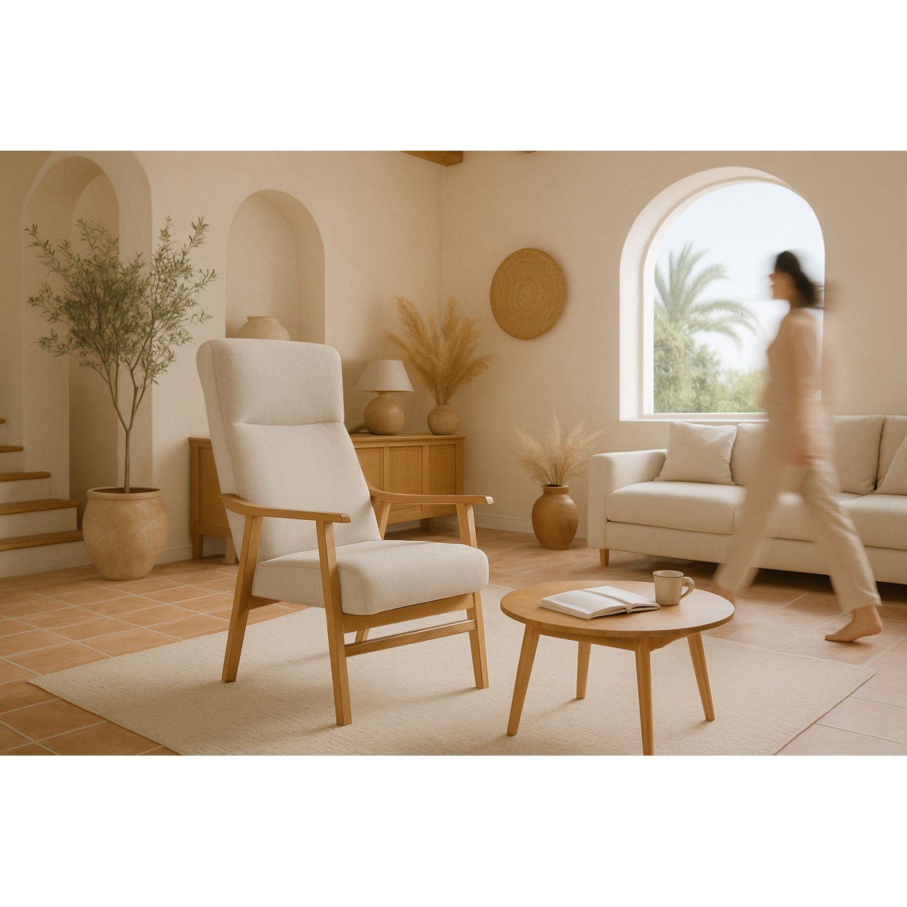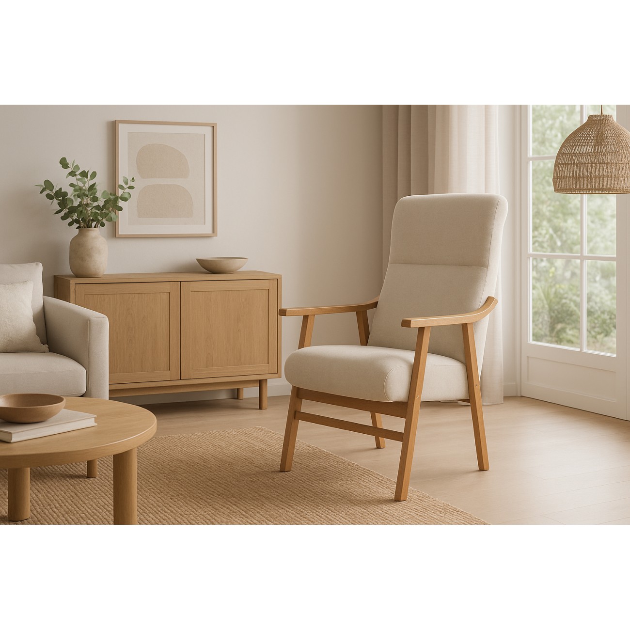 Sillón con armazón de madera de haya barnizada en color haya, asiento y respaldo alto acolchados y tapizados en tela antimanchas de fácil limpieza.