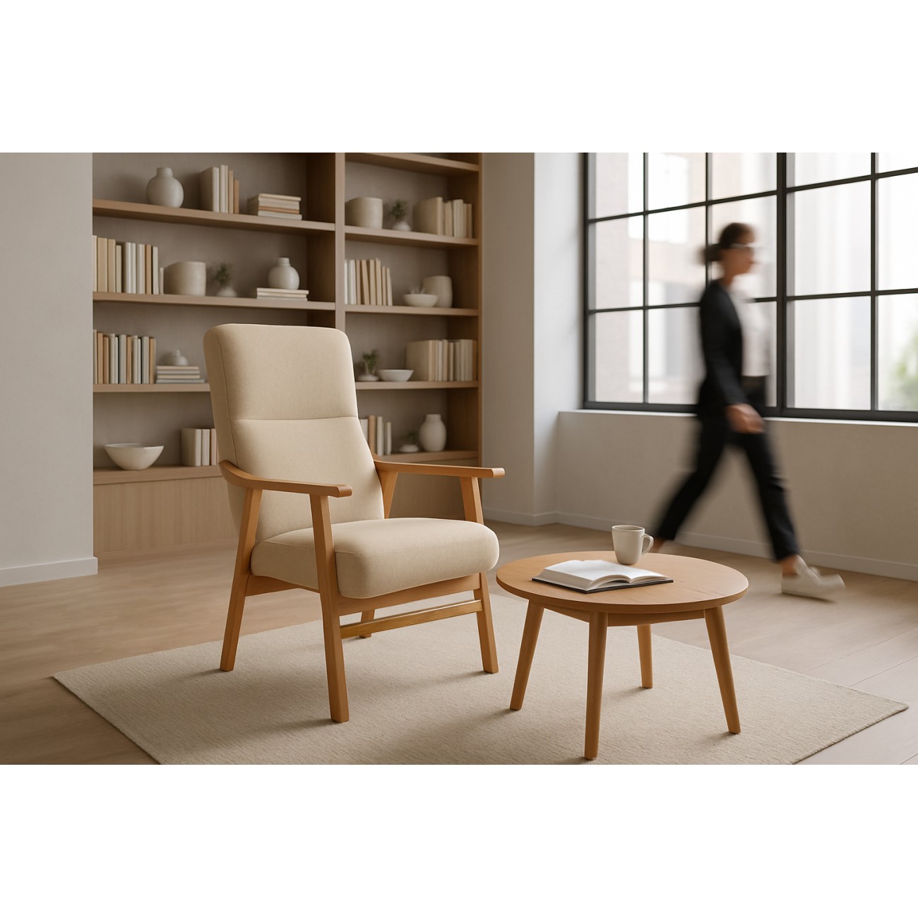 Elegante butaca de estilo nórdico con patas cilíndricas de madera...